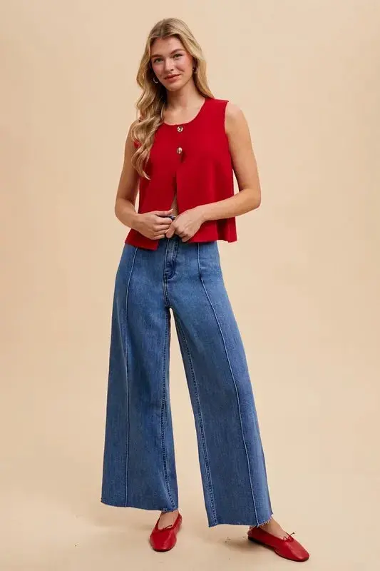 This knit vest has metal buttons for a stylish look and a cropped length that’s perfect for layering. It’s an easy way to add a trendy touch to your outfit.